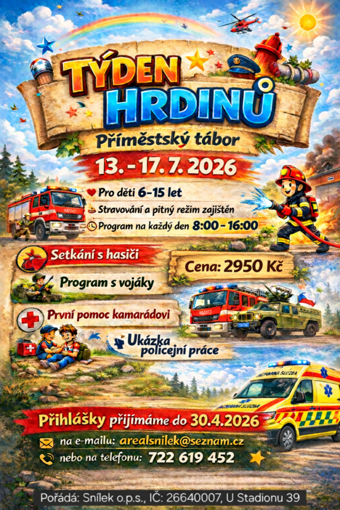 Staň se na týden skutečným hrdinou! Děti si vyzkouší práci hasičů, vojáků i záchranářů, naučí se základy první pomoci a zjistí, jak funguje policejní práce.